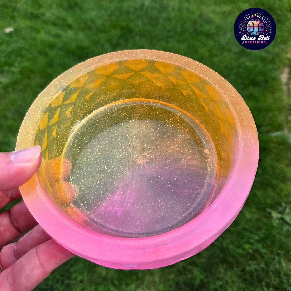 Handcrafted with high-quality resin, this generous-sized bowl features a textured, faceted exterior and is infused with shimmering glitter. It’s the perfect functional accent for your desk, vanity, or kitchen, offering a fun touch of Whimsical Joy while providing versatile storage.